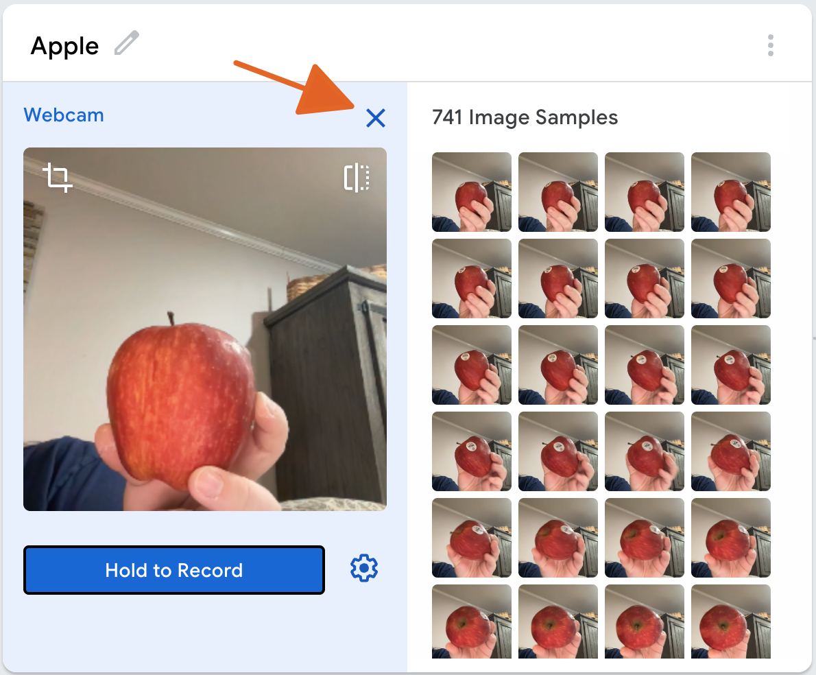 - Position your apple within the frame and click the “Hold to Record” button to begin capturing images of the apple. You will want to move the apple around so it captures different angles and distances. Capture 100-200 images.
