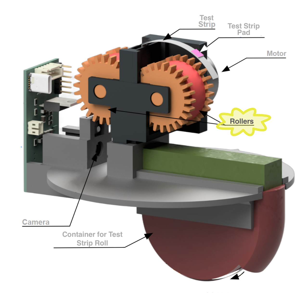 The canister stores the rolled-up test strip and feeds it out as the motor and rollers advances it.